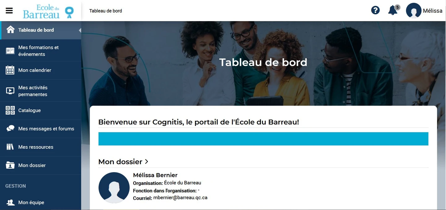 Cognitis est la plateforme de gestion des apprentissages de l’École du Barreau permettant aux candidates et aux candidats d’accéder au matériel pédagogique et aux ressources en ligne, de n’importe où, sur l’appareil de leur choix.